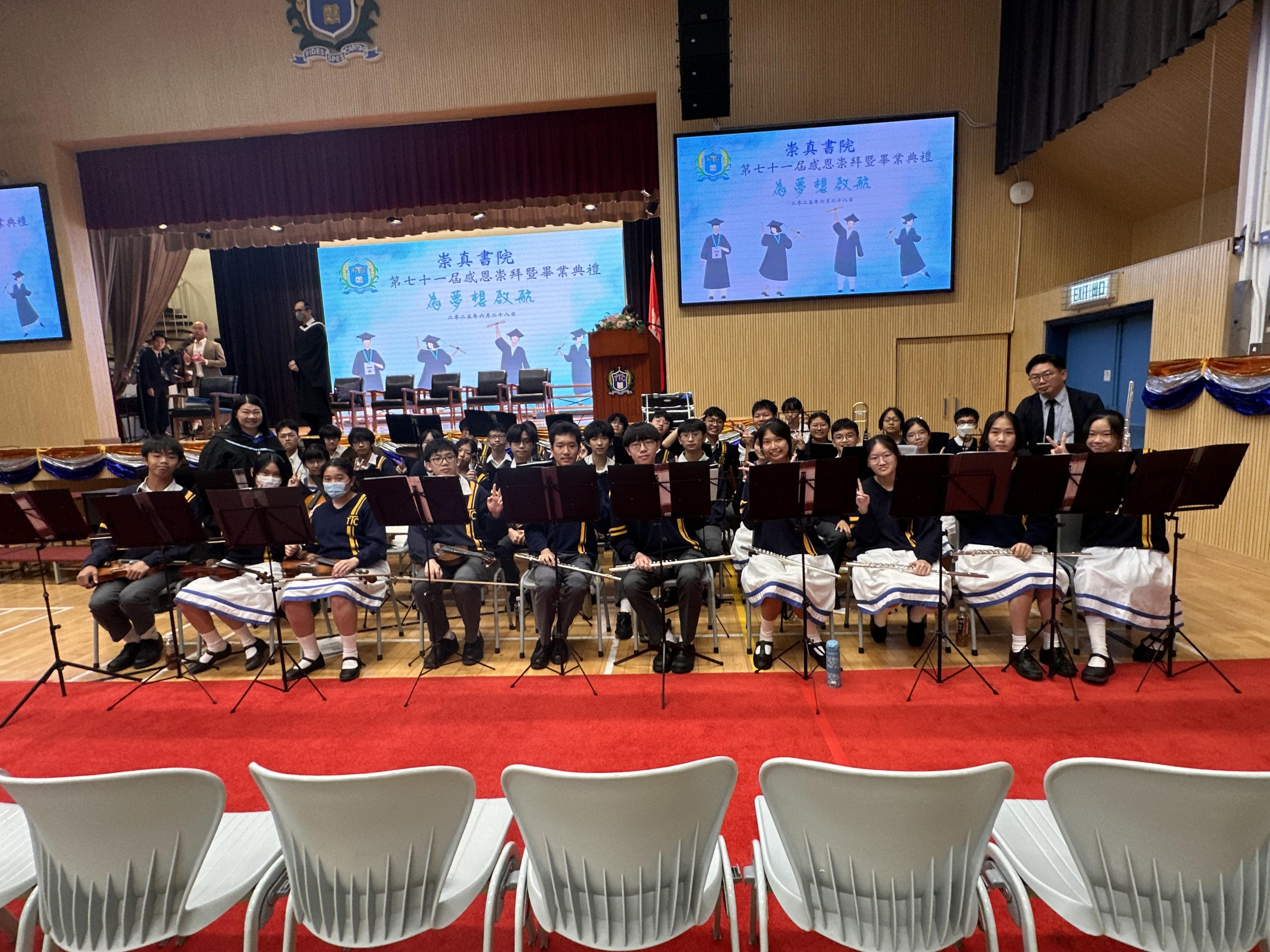 Every year, the school also invites choirs and orchestras to perform at the Secondary Six Graduation Ceremony. The orchestra will play the prelude, glory to the true God, and perform songs and temple music. The choir will also sing a graduation theme song.